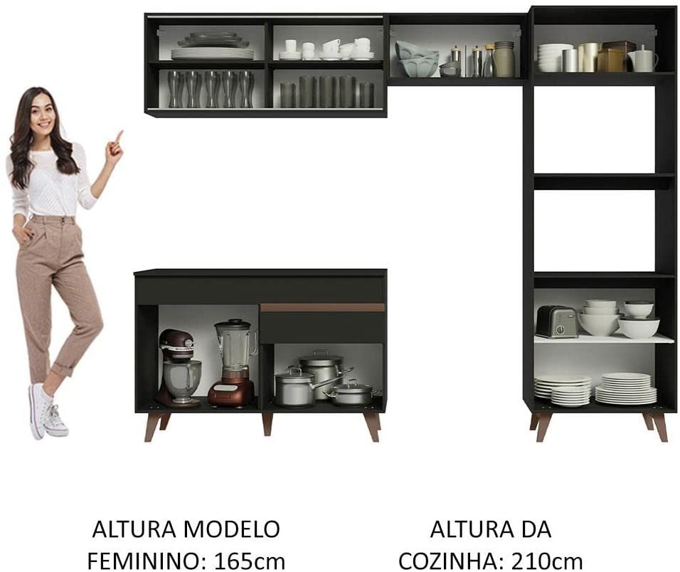 Totalmente modulada, possui muito espaço disponível, ideal para organizar utensílios, panelas, louças e o que mais você preferir. Além disso, a torre quente oferece espaço para a colocação de forno elétrico e micro-ondas.