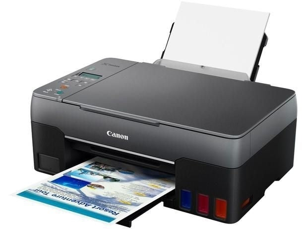 IMPRESSORA CANON MULTIFUNCIONAL SEM FIO MEGA TANK G3160 TANQUE DE TINTA. IMPRESSORA CANON MULTIFUNCIONAL SEM FIO MEGA TANK G3160 TANQUE DE TINTA - Características: - Marca: Canon - Modelo: 4468C005AA - Velocidade de Impressão: - Foto colorida sem borda 10x15 cm: aprox. 45 segundos - Documento PB (Carta Simplex): aprox. 10,8 ipm (ESAT) ou aprox. 32,0 ppm - Documento Colorido (Carta Simplex): aprox. 6,8 ipm (ESAT) ou aprox. 16,0 ppm - Número de bicos ejetores: - Colorido: 1.152 bicos Preto pigmento: 640 bicos Total: 1.792 bicos - Resolução de impressão: - Até 4800 x 1200 dpi - Ciclo de trabalho e volume de impressão: - 3.000 Páginas mês - Tamanhos de papel: - A4, A5, A6, B5, Carta, Ofício, 4? x 6?, 5? x 7?, 7? x 10?, 8? x 10?, Envelopes (DL, COM10), Quadrado (89 mm x 89 mm), Quadrado (127 mm x 127 mm), Cartão (91 mm x 55 mm), Banner (até 1,200 mm x 216 mm), Personalizado (largura 55 mm - 216 mm, largo 89 mm - 1200 mm) - INFORMAÇÃO DE TINTAS: Garrafas de tintas e capacidade: - GI-11 Tinta pigmentada preta: 135 ml. GI-11 Tintas à base de corantes: 7